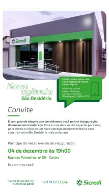 “A expectativa é de que essa inauguração seja um marco para a cidade e toda a população de São Desidério. Será a consolidação do nosso espaço físico, um momento especial e muito esperado. Queremos que os associados vivenciem essa conquista junto conosco”, destaca Fabiano Ferreira, gerente da nova unidade.