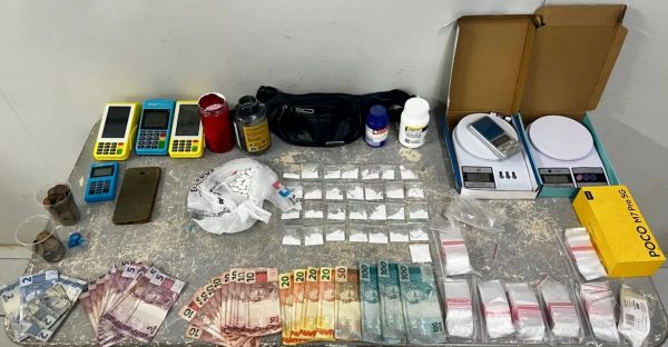 Durante a operação, as equipes ainda localizaram dinheiro em espécie, em cédulas de diferentes valores, moedas, aparelhos celulares, maquininhas de cartão e balança de precisão, materiais comumente associados à prática do tráfico de drogas.
