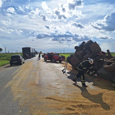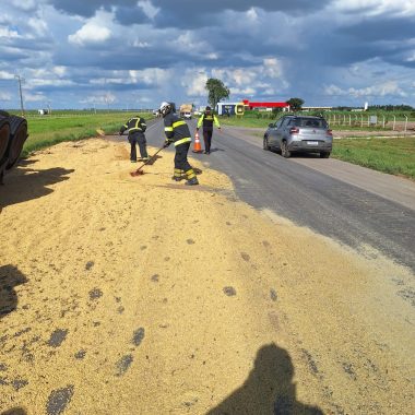 De acordo com informações repassadas ao Corpo de Bombeiros, a ocorrência teria sido provocada por uma colisão lateral envolvendo dois caminhões. No entanto, ao chegar ao local, a guarnição encontrou apenas um dos veículos envolvidos tombado às margens da rodovia, com grande quantidade de grãos de soja espalhada nas proximidades do acostamento.