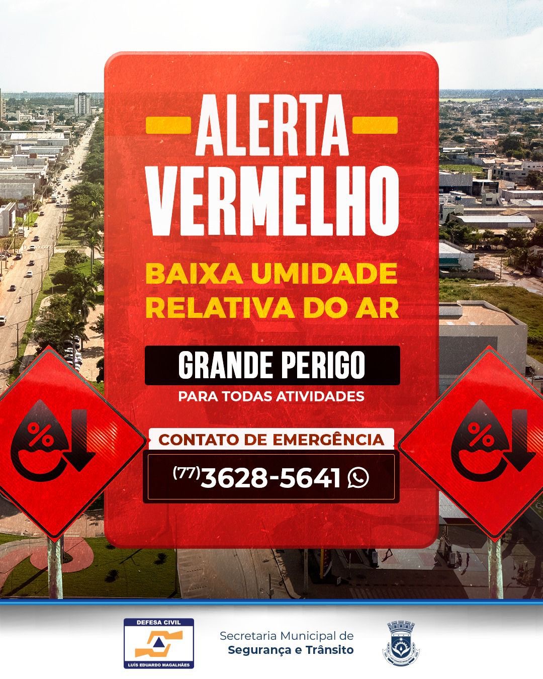 O Instituto Nacional de Meteorologia emitiu nesta terça-feira (30) de setembro, *ALERTA VERMELHO DE BAIXA UMIDADE* em Luís Eduardo Magalhães. *Umidade relativa do ar abaixo de 12%.* Grande risco de incêndios florestais e a saúde (doenças pulmonares, dor de cabeça e etc). Tipo: baixa umidade (GRANDE PERIGO). Início 30/09/2025 10:00 Término 30/09/2025 18:00 Instruções: Beba […]